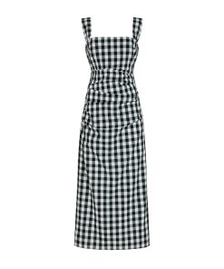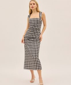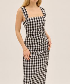 Retro-inspired and effortlessly flattering. The Rita Gingham Dress is crafted from a breathable linen blend in a bold black-and-white check, with wide gathered straps and gentle ruching through the bodice for a sculpted, feminine fit. The column skirt skims the body for a sleek silhouette that’s easy to dress up or down.