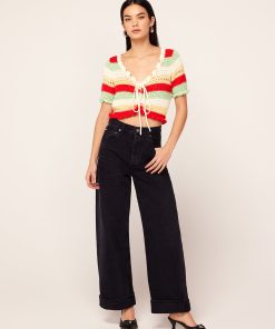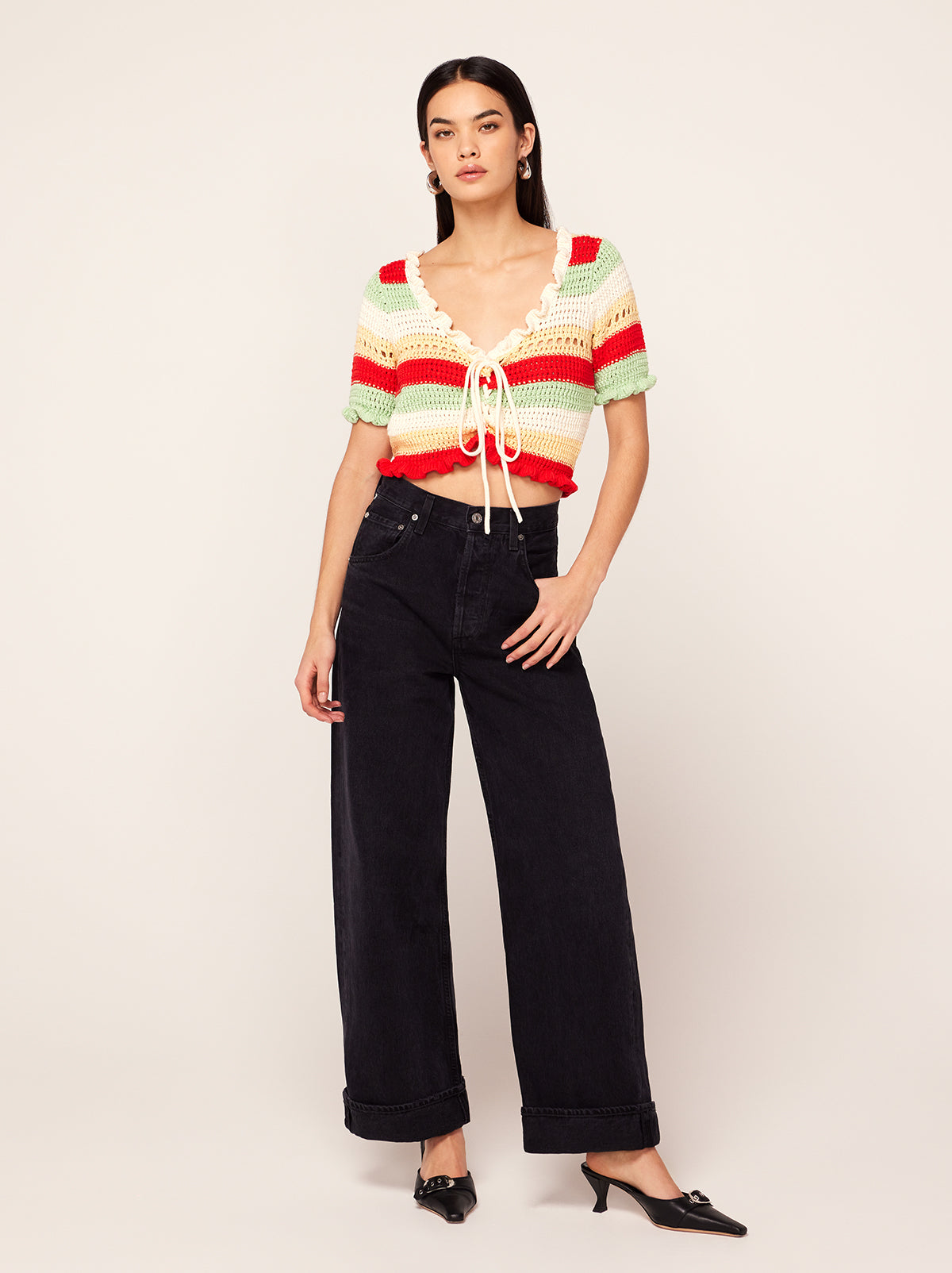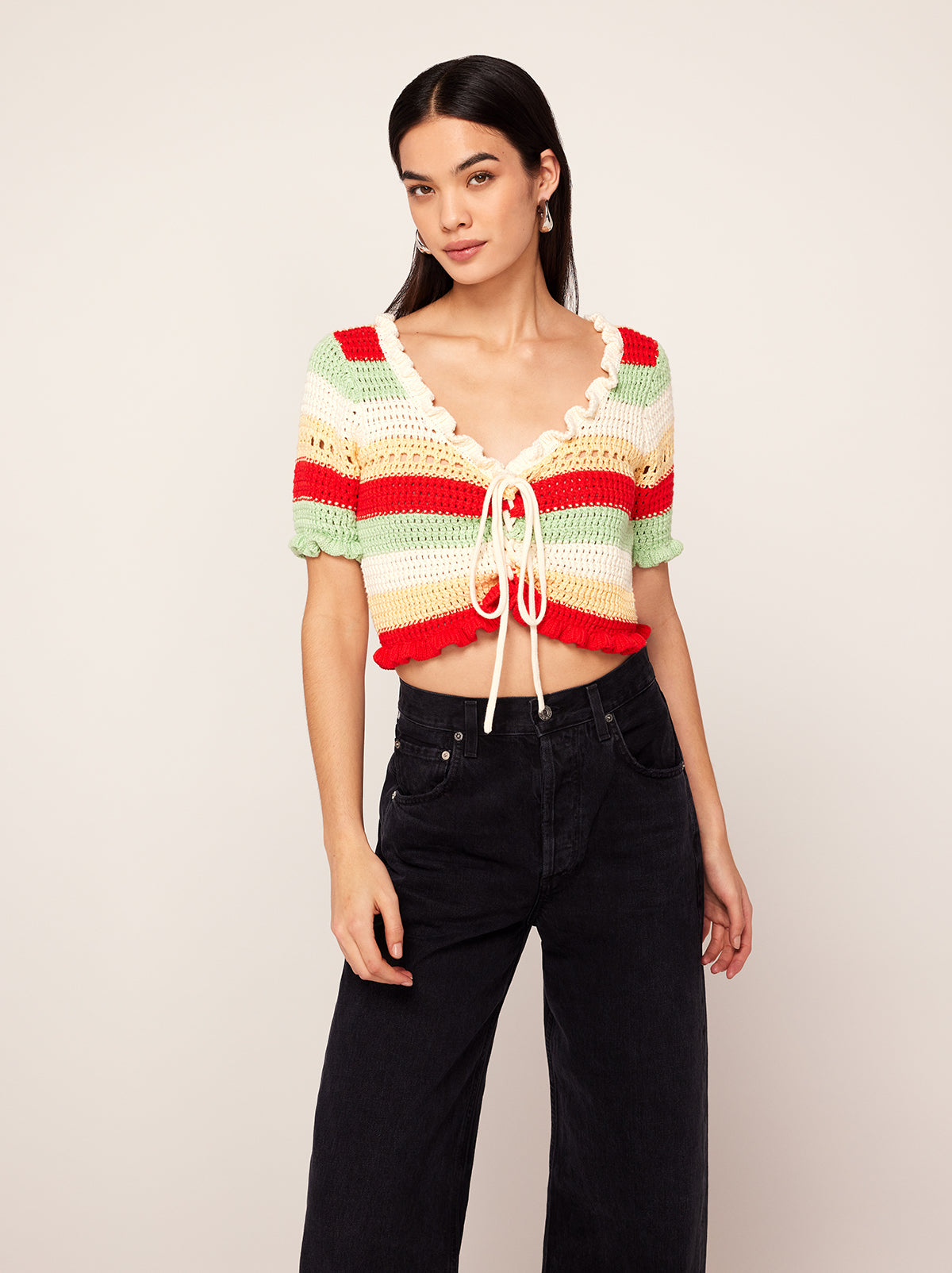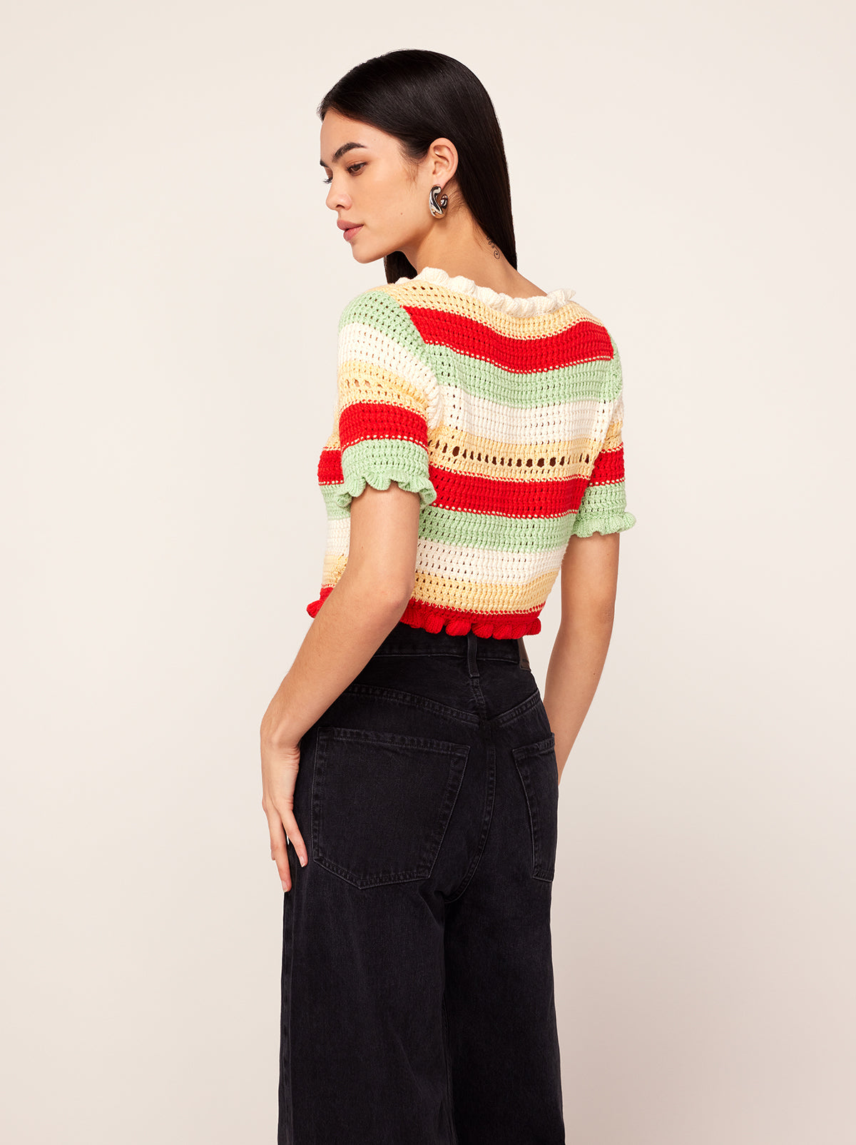 The cardigan of your spring dreams. Ally is a scoop neck, crochet knit in the perfect cropped length to skim the top of your high-waisted jeans. Her mood-boosting stripes in spring-hued yarn are the perfect pick-me-up as the weather warms.