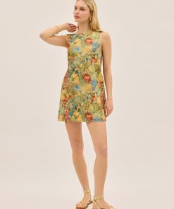 A fresh take on a forever favourite. The Angelica Dress is cut in our painterly fruit print with a clean A-line silhouette and flattering high neckline. The shift shape keeps things easy and modern, while sweet bow details at the shoulders bring a playful finish.