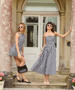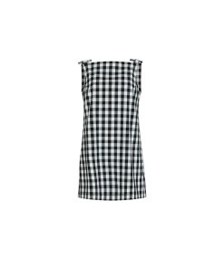 Easy, charming, and ready for wherever the day takes you. The Angelica Mini Dress is cut from a breathable black-and-white gingham linen blend in a classic A-line shift silhouette. It features a high, straight neckline and sweet bow details at the shoulders for a playful finish.