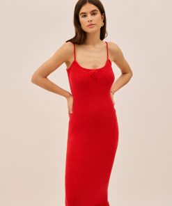 All eyes on Bettyâ€â€Âa statement dress that brings romance and drama in equal measure. Crafted from a lightweight crepe yarn, this knit midi dress is designed for a figure-hugging fit, complete with delicate spaghetti straps and fixed knitted rose brooches along the neckline for a playful, feminine touch. The frilled hem adds soft movement, making every step a moment.