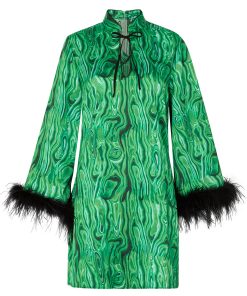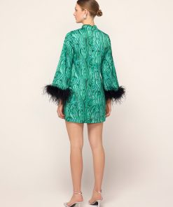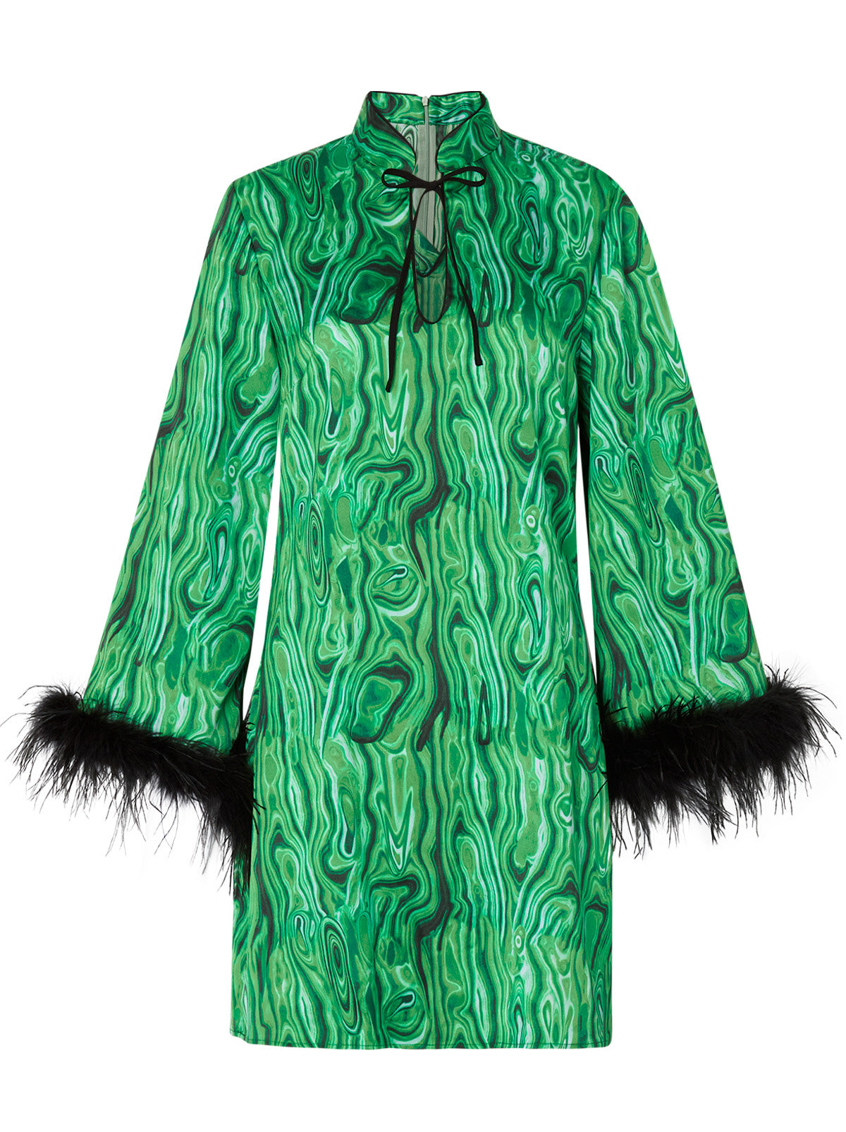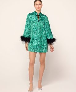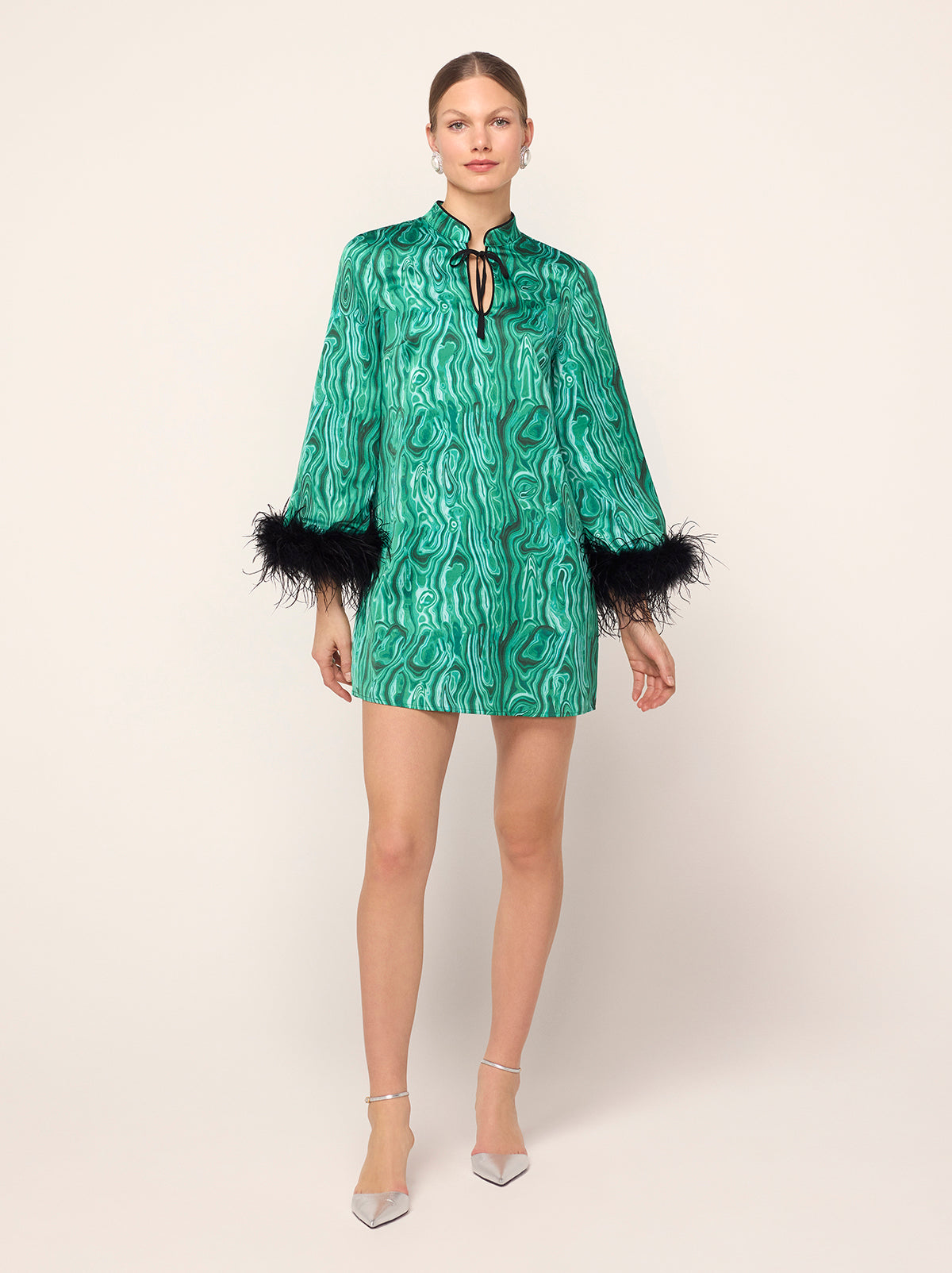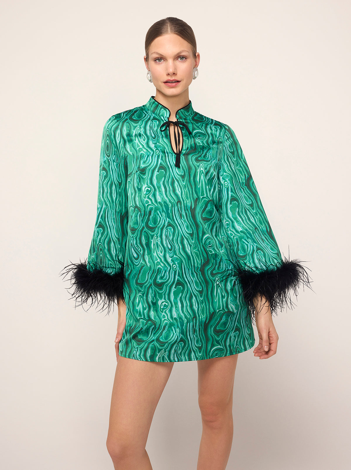 Carlotta is the mini party dress that demands attention. With its striking, in-house designed malachite print in rich shades of green, this dress is guaranteed to turn heads. The Cheongsam-inspired collar lends a touch of refinement, while the relaxed fit ensures ease and comfort – perfect for dancing the night away. Whether you’re making a grand entrance or slipping into the coolest afterparty, Carlotta’s 1960s vibe pairs effortlessly with bold accessories and statement heels.