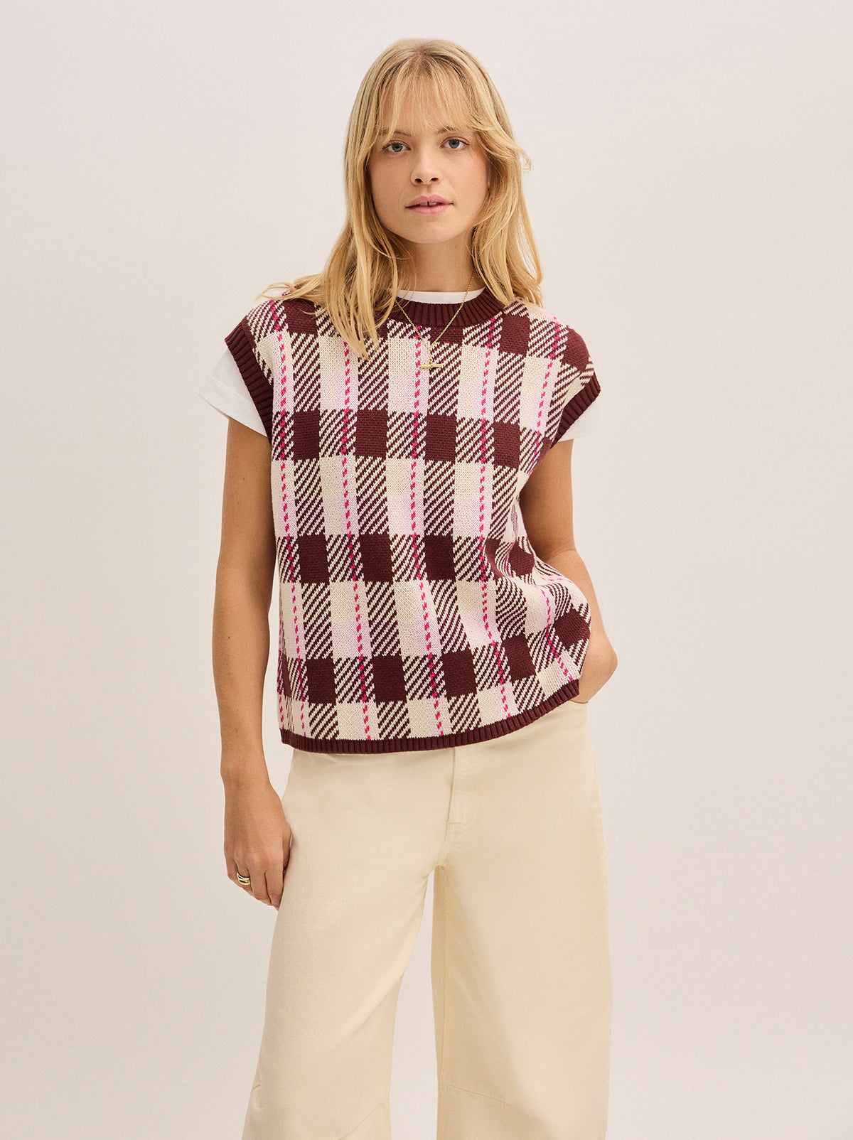 Chic and slouchy. The Dree Pink Check Vest is a brilliant layering piece featuring a relaxed, oversized-fit and a round neck. Crafted in mid-weight cotton/viscose blend that can be worn all year around, layer over your favourite white tee or a crisp button down shirt for a more polished look. You’ll reach for Dree time and time again.
