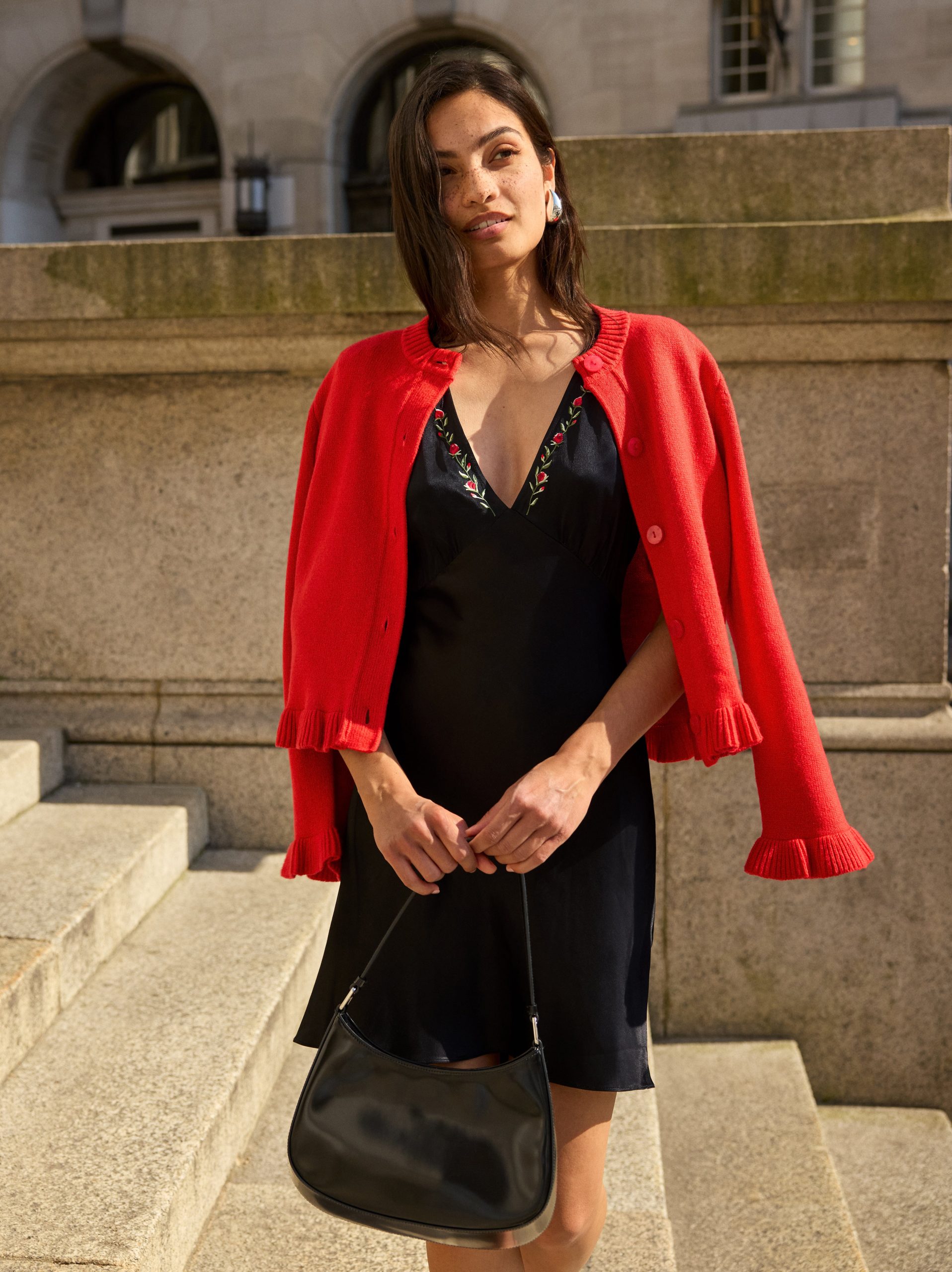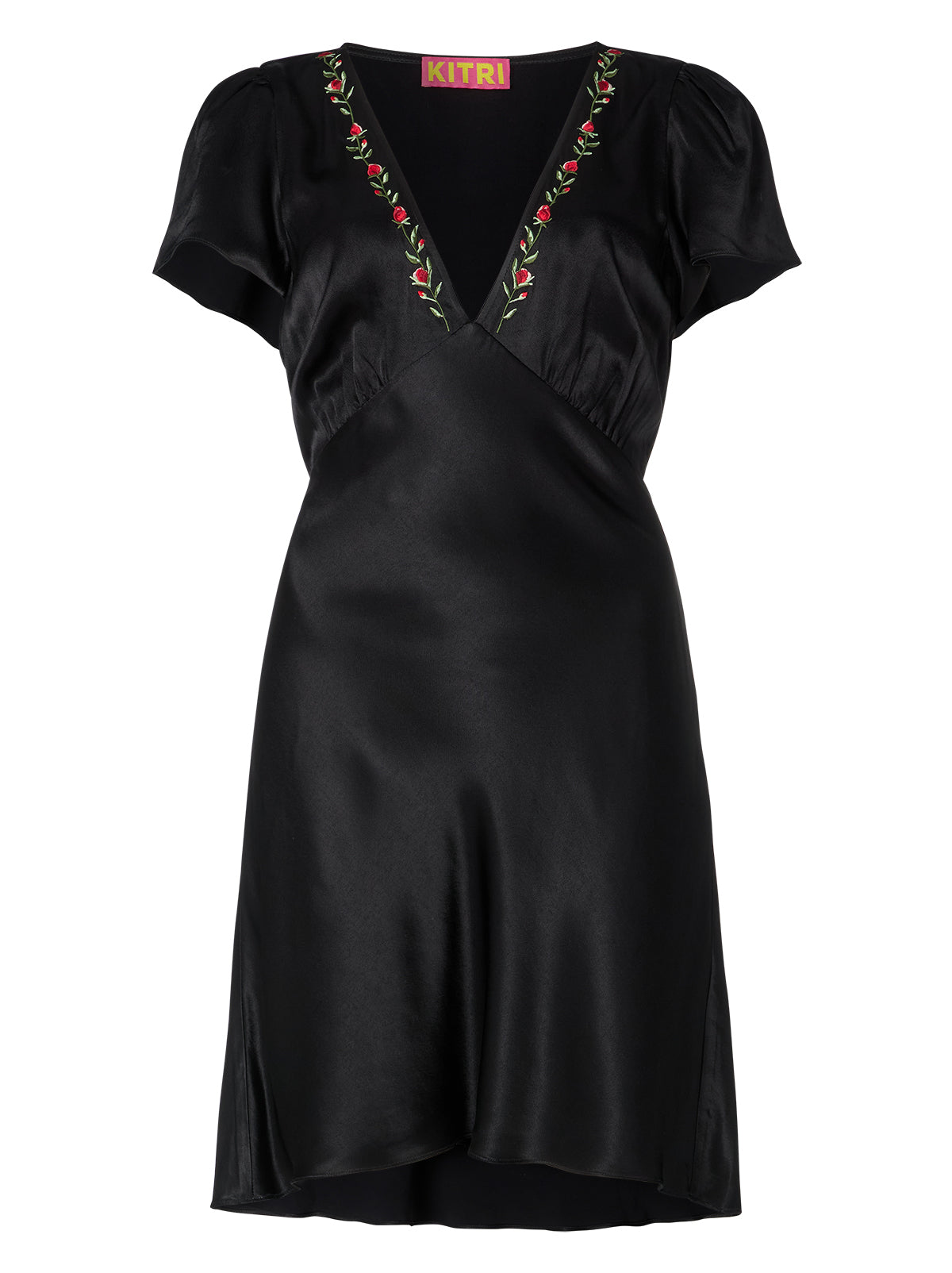 Meet the Florence dress – the little sister to our bestselling Talia. Crafted from liquid black satin and cut on the bias for a flattering drape, this mini dress features a deep V-neckline, short sleeves, and a softly skimming empire line. Delicate rosebud embroidery frames the neckline, while a tie-back detail adds a romantic finish. A versatile statement piece with timeless appeal.