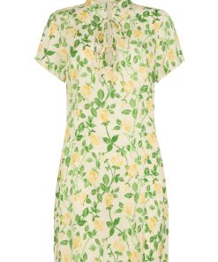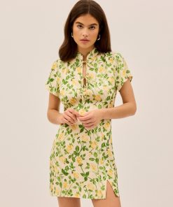 A KITRI Girl favorite and bestseller, now in a fresh yellow rose print. The Gretchen Mini Dress is a cheongsam-inspired design, featuring delicate tie details at the neckline, short sleeves, and a subtle leg split for just the right amount of movement. Cut from printed viscose jacquard, it has a structured-yet-fluid feel that’s perfect for dressing up or down.