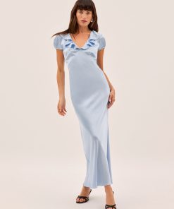 Introducing the Minka dress – a new romantic silhouette in a dreamy powder blue hue. Crafted from fluid viscose satin and bias-cut for an elegant drape, it features a flattering empire line, deep V-neckline with soft frill detail, and short puff sleeves. Perfect for summer soirées or special moments, it’s a fresh take on occasion dressing with vintage charm.