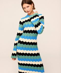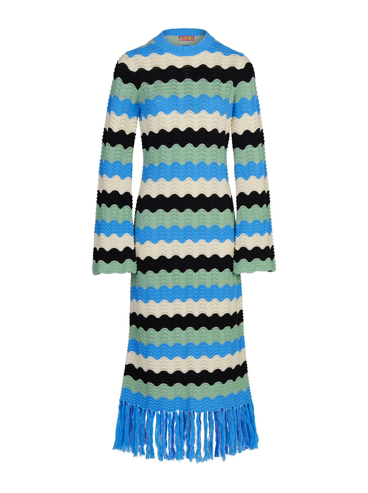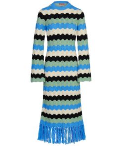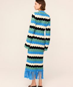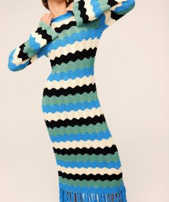 Crochet dream. Ondine is our latest crochet midi dress made for transitional weather in compact cotton and viscose blend yarn. The playful fringe detail and the colourful wave stripe in blue, black and ivory will have you collecting compliments all day long.