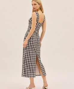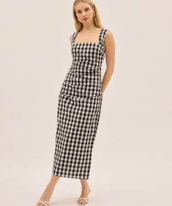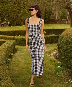 Retro-inspired and effortlessly flattering. The Rita Gingham Dress is crafted from a breathable linen blend in a bold black-and-white check, with wide gathered straps and gentle ruching through the bodice for a sculpted, feminine fit. The column skirt skims the body for a sleek silhouette that’s easy to dress up or down.