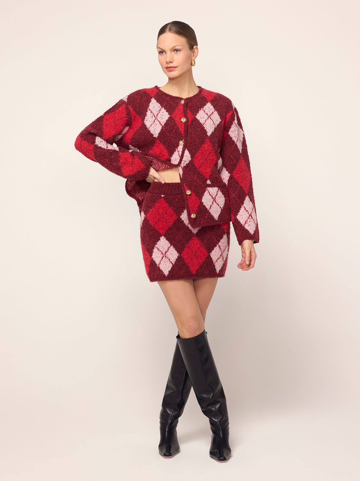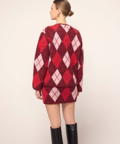 Just tell them it’s vintage. Susan is a cosy mini skirt that combines retro charm with modern-day wearability. Her bold burgundy argyle print is eye-catching yet refined, and the textured bouclé fabric provides warmth and comfort as the cooler months roll in. Susan’s flattering fit ensures she’ll quickly become a favourite in your wardrobe, whether you style her with tights and boots or opt for a bare-legged look when the weather allows. For the ultimate throwback vibe, pair Susan with the matching Pandora Burgundy Argyle Knit Cardigan for a co-ordinated set that’s both nostalgic and contemporary.