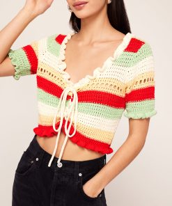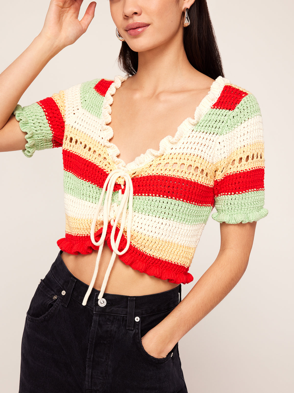 The cardigan of your spring dreams. Ally is a scoop neck, crochet knit in the perfect cropped length to skim the top of your high-waisted jeans. Her mood-boosting stripes in spring-hued yarn are the perfect pick-me-up as the weather warms.