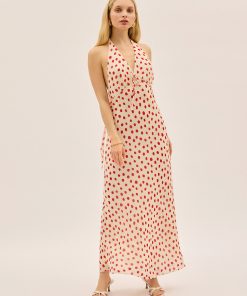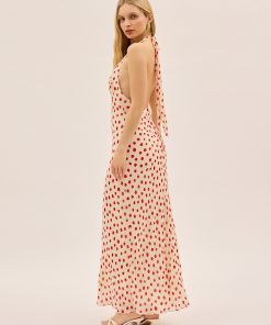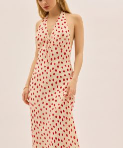 Playful, feminine and cut to flatter, Amalia is the dress everyone will ask about. Designed in a painterly red polka dot print, this halterneck maxi features a deep V neckline with delicate tie detail and a softly flared silhouette. Fully lined for ease and elegance, she’s the one you’ll reach for again and again – wedding guest days, late summer dinners, and everything in between.