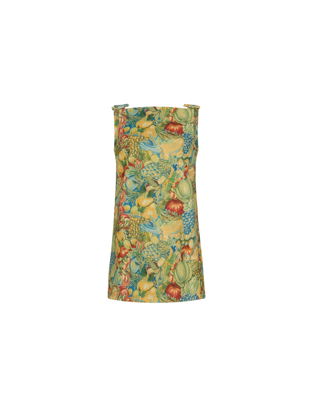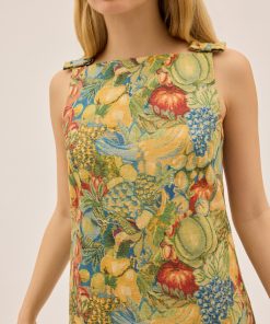 A fresh take on a forever favourite. The Angelica Dress is cut in our painterly fruit print with a clean A-line silhouette and flattering high neckline. The shift shape keeps things easy and modern, while sweet bow details at the shoulders bring a playful finish.
