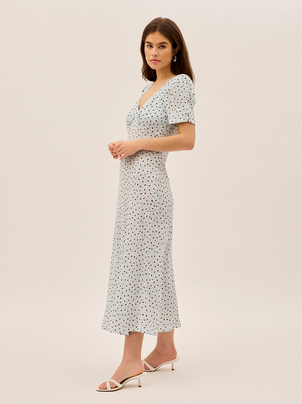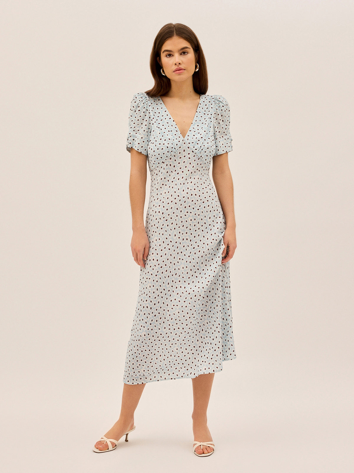 Say hello to Brianna, the vintage-inspired tea dress your wardrobe has been waiting for. Designed in a charming blue daisy print, this effortlessly feminine midi dress features a flattering V-neckline and softly puffed sleeves for a touch of timeless romance. Cut from lightweight viscose crepe, it drapes beautifully while keeping you comfortable all day long. Whether you’re heading to brunch, a garden party, or just want to elevate your everyday style, Brianna is the perfect choice. Just add your favourite heels or boots and let the compliments roll in.