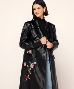 Skip the cloakroom. Brogan is an oversized, double-breasted coat in high-shine vinyl with an ’80s-inspired statement shoulder and peaked lapel. Her bold silhouette is tempered by a tonal placement floral embroidery. Wear with co-ordinating Carolyn Black Embroidered Vinyl Mini Dress for a full glossy-chic look.