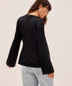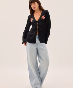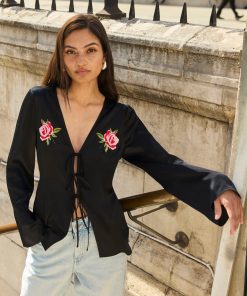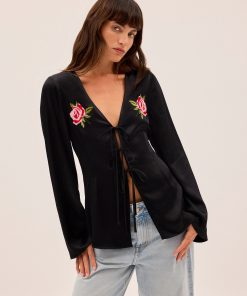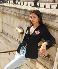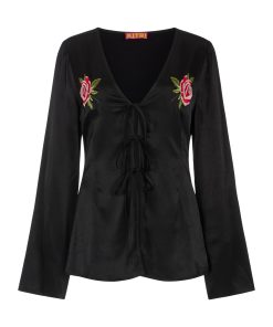 The Brooke top is a statement piece in fluid black viscose satin, designed with a flattering V-neckline and softly flared sleeves. Its longline silhouette features delicate tie-front details, each secured with hidden buttons for a refined finish. Embroidered rose motifs at the chest add a romantic touch to this modern classic. Style with denim or tailoring for effortless day-to-night appeal.