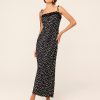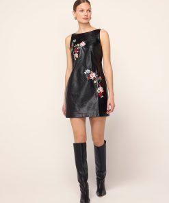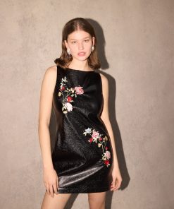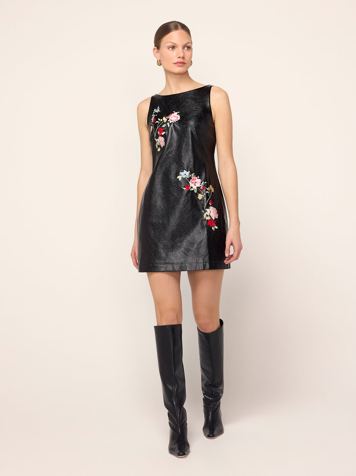 Your time to shine. Carolyn’s ’90s-inspired mini shift silhouette skims the body perfectly and her slash neck means she’s bra-friendly too (you’re welcome). Wear with the co-ordinating Brogan Oversized Black Embroidered Vinyl Coat for a full glossy-chic look.