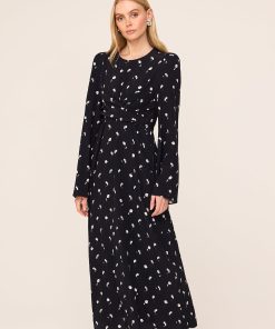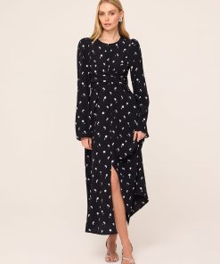 She’s demure. Catarina is a new midi dress silhouette with long flared sleeves and flattering wrap detail around the waist. The centre slit on her skirt makes it easy to show off your favourite knee high boots too. Layer under a knit for an easy, chic daytime look or with heels at night for the perfect dinner date outfit.