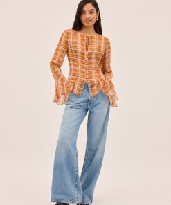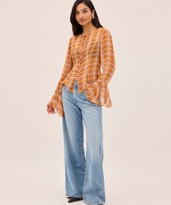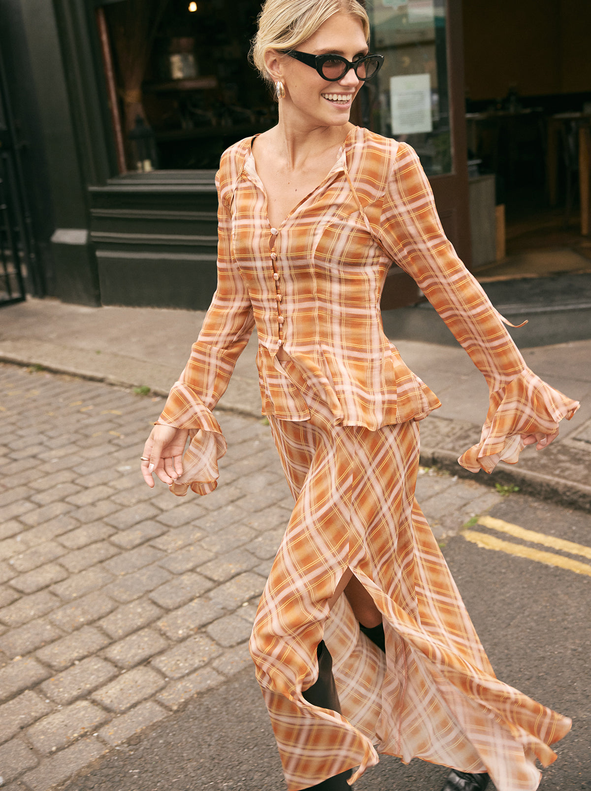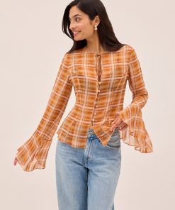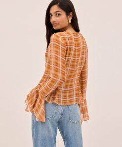 The Chantelle top blends bohemian charm with cool check print. Crafted from semi-sheer viscose georgette in our in-house designed apricot check, it features flared sleeves, a wide neckline with delicate tie detail, and self-covered buttons through the front. Godet panels at the hem create a flattering flare, while the unlined finish keeps it light and effortless. Perfect with denim or with the matching Zoe Skirt for the full boho look.