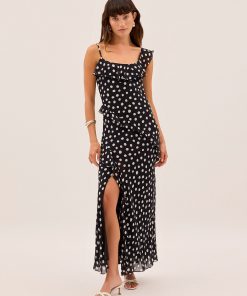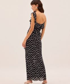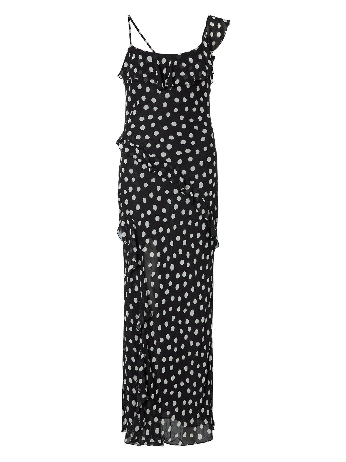 Meet the dress everyone will be asking about. The Delphina Dress is a bold new silhouette in timeless polka dot print. Cut in a lightweight, fluid fabric and fully lined for a seamless fit, it features an asymmetric frilled neckline and a diagonal frill that sweeps across the skirt. A split at the leg adds just the right amount of drama.