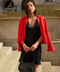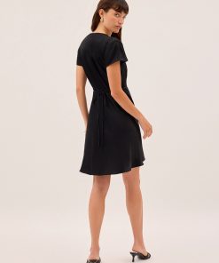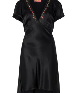 Meet the Florence dress – the little sister to our bestselling Talia. Crafted from liquid black satin and cut on the bias for a flattering drape, this mini dress features a deep V-neckline, short sleeves, and a softly skimming empire line. Delicate rosebud embroidery frames the neckline, while a tie-back detail adds a romantic finish. A versatile statement piece with timeless appeal.