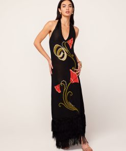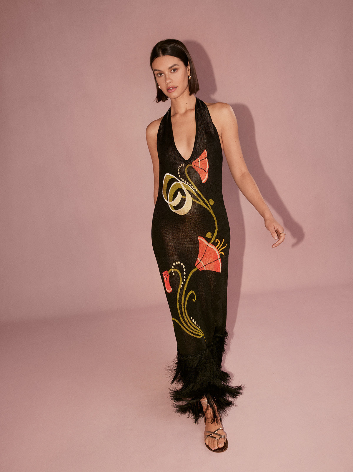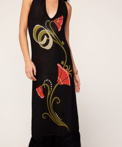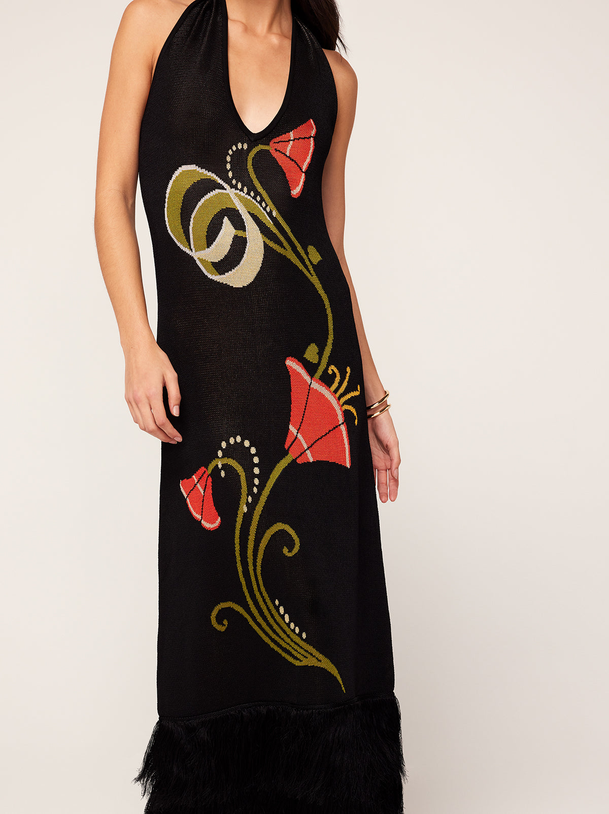 Georgia on your mind. She’s a halter-neck knitted dress made for something fancy. Flattering and figure-hugging, she’s a jacquard knit with a sleek, compact finish and her hem fringing adds something fancy. Who said comfort needed to be compromised?