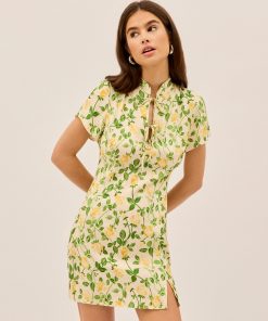 A KITRI Girl favorite and bestseller, now in a fresh yellow rose print. The Gretchen Mini Dress is a cheongsam-inspired design, featuring delicate tie details at the neckline, short sleeves, and a subtle leg split for just the right amount of movement. Cut from printed viscose jacquard, it has a structured-yet-fluid feel that’s perfect for dressing up or down.