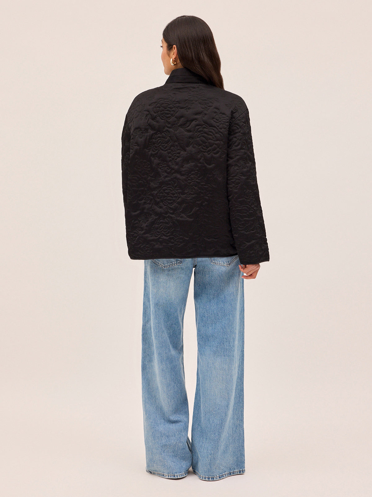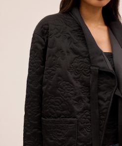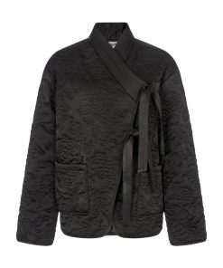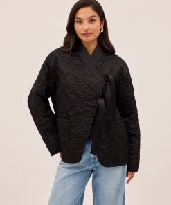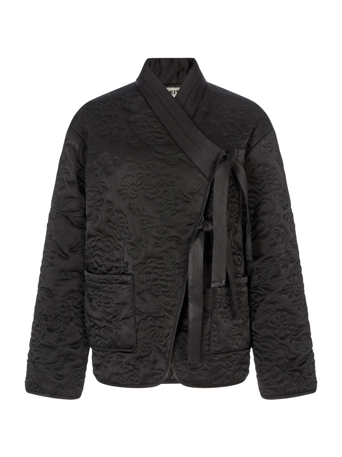 Lightweight, versatile, and artfully detailed – the Hani jacket is designed to be worn year-round. Cut from lustrous black viscose satin, it’s lightly quilted with an intricate floral pattern inspired by traditional Korean paintings. The silhouette nods to Hanbok design with its cross-over ties and subtle stitch detailing, creating a piece that feels both timeless and contemporary. Wear it as an elevated everyday layer or draped over evening looks for a polished finish.