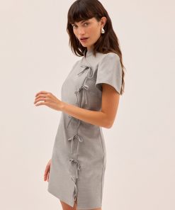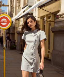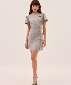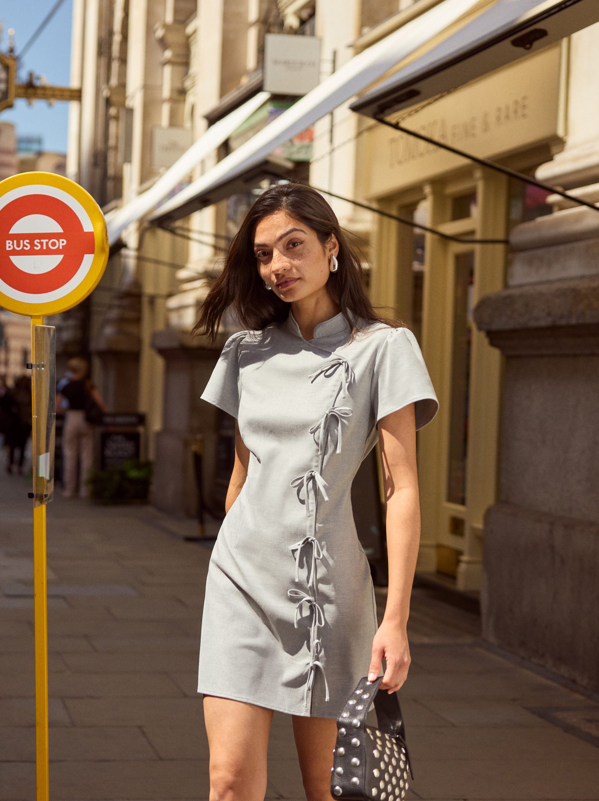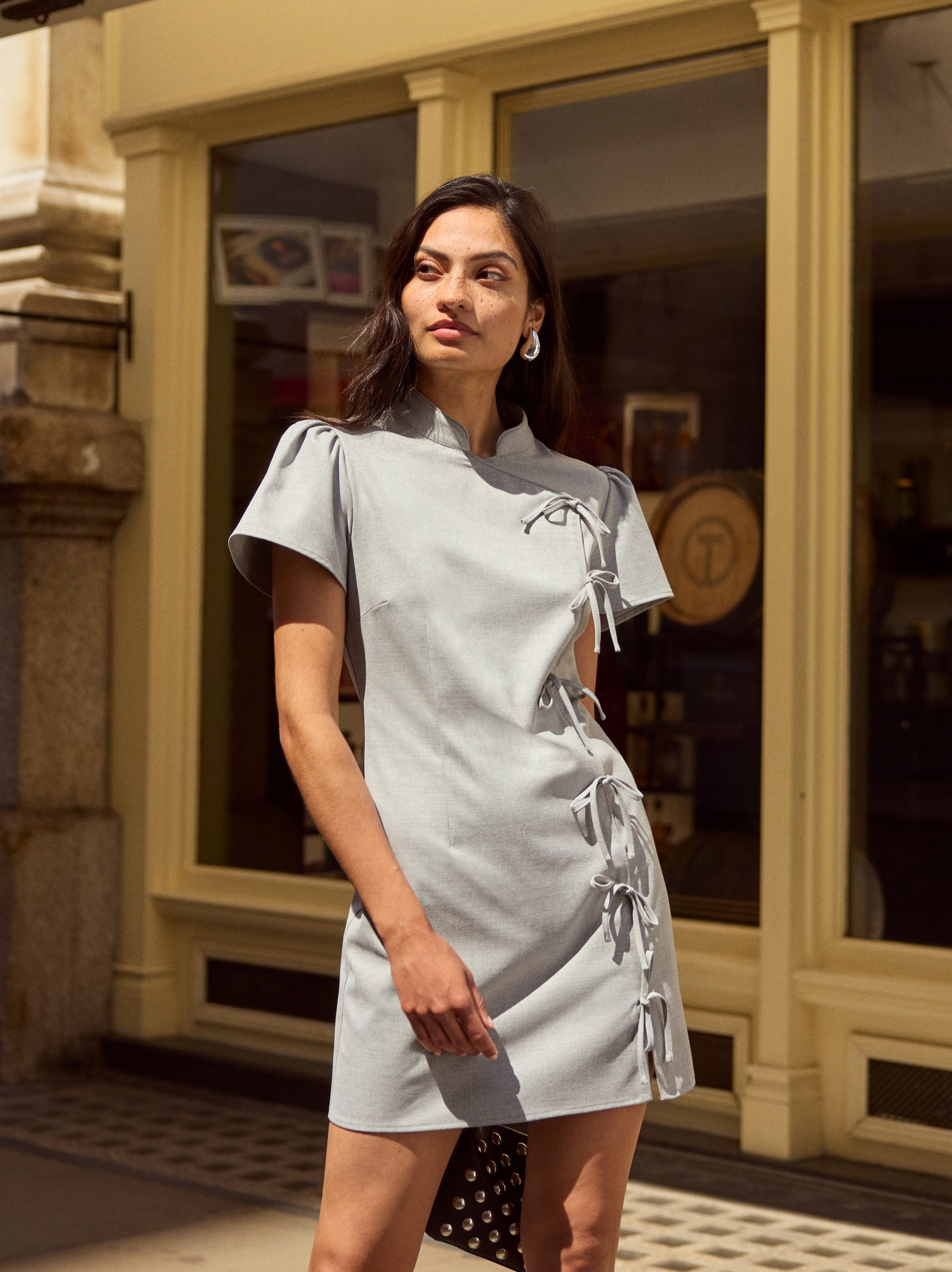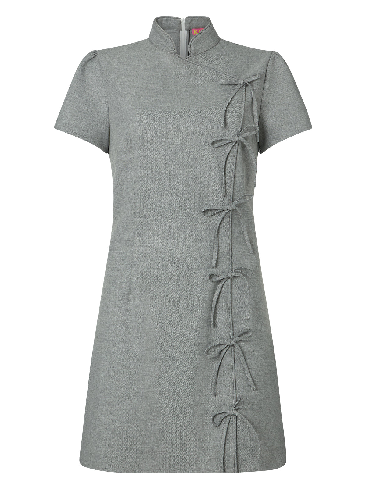 The Harlow dress is a KITRI icon for a reason. This bestselling silhouette returns in soft, grey deadstock tailoring fabric, blending sharp lines with feminine charm. Featuring a flattering cheongsam-inspired shape, tie-front detail, and a subtle split at the leg, it’s the perfect piece to take you from desk to dinner with ease.