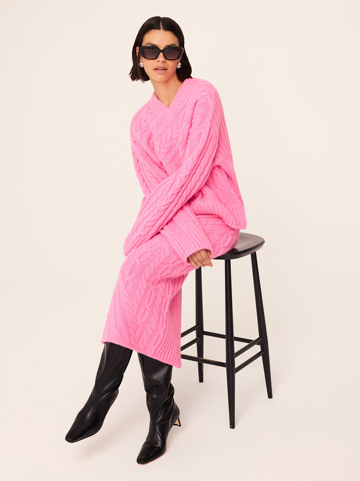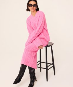 Add a pop of colour to your winter wardrobe with the perfect knit skirt. Imelda is a cosy midi-length knit skirt in patched cable knit with a ribbed waistband and centre-back split. Pair her with a white tee for an laid-back look, or with the matching Everly Pink V-Neck Jumper for the ultimate winter co-ordinated look.