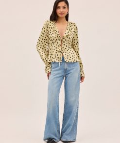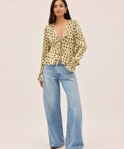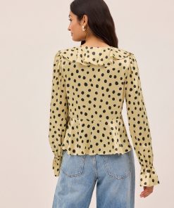 Romantic and effortless, the Ione top is new silhouette in soft, fluid viscose satin. Designed in timeless polka dot in butter soft yellow hue, it features a deep V-neckline with delicate frill trim, a tie-front fastening, and long sleeves finished with softly gathered cuffs. An easy statement piece that adds a touch of femininity to everyday looks.