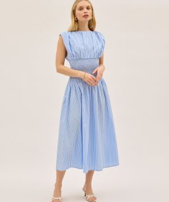 Crisp cotton, flattering shape, effortless charm. The Julia Dress is cut in a soft blue stripe with a wide boat neckline, gently gathered bodice and a shirred dropped waist that defines the silhouette. The full, A-line skirt falls to a midi length for an easy, throw-on-and-go feel without compromising on polish.
