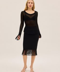 The after-dark knit you didn’t know you needed. The Katrina Top is crafted from a lightweight, open-stitch knit that’s semi-sheer and effortlessly draped. Designed with a wide, round neckline and statement fringing at the cuffs, it’s the kind of piece that turns heads without even trying.