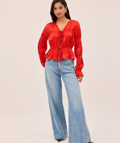 Vintage-inspired with a modern edge, the Maia Top in brilliant red is here to elevate your wardrobe. Designed in luxurious satin with a flattering gathered bodice and sleeves, this long-sleeve blouse brings effortless femininity to any look. The tie fastening with button details at the front ensures both style and function.