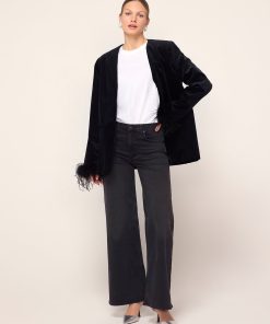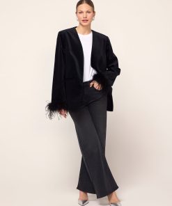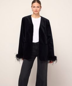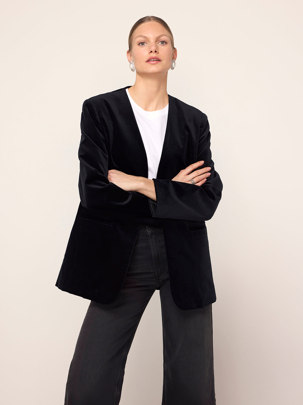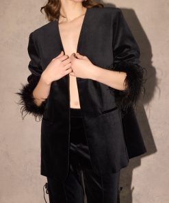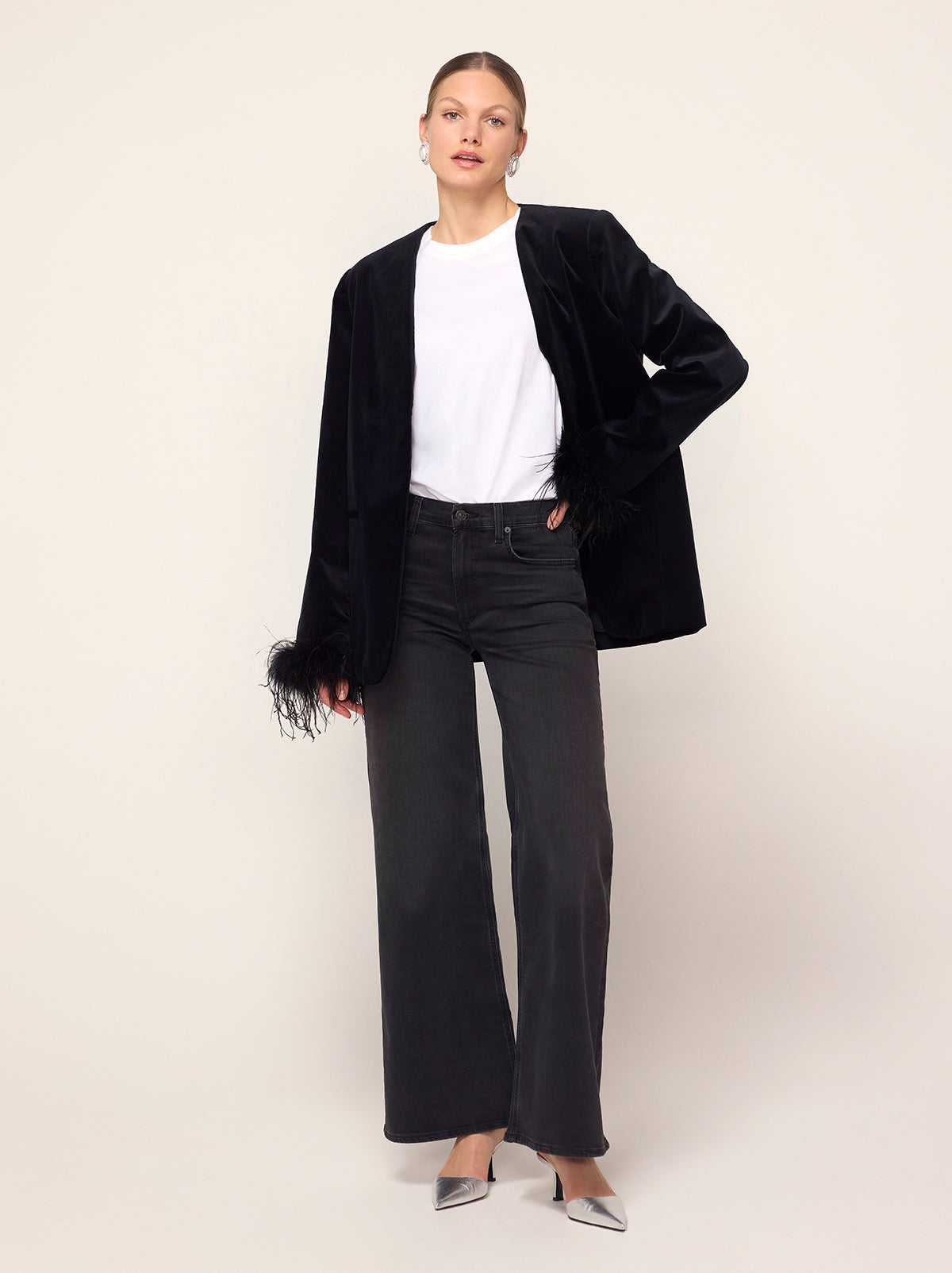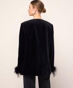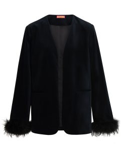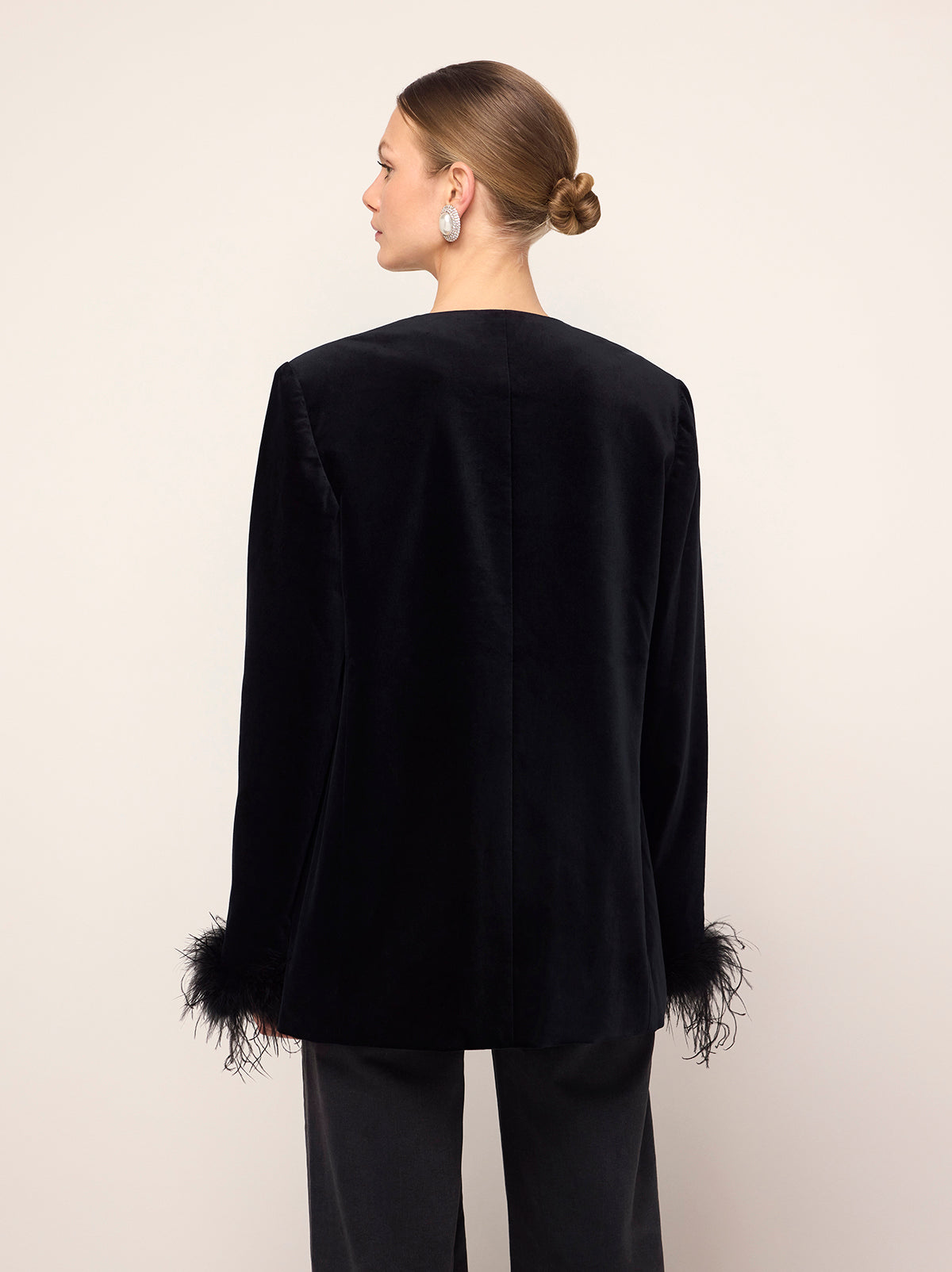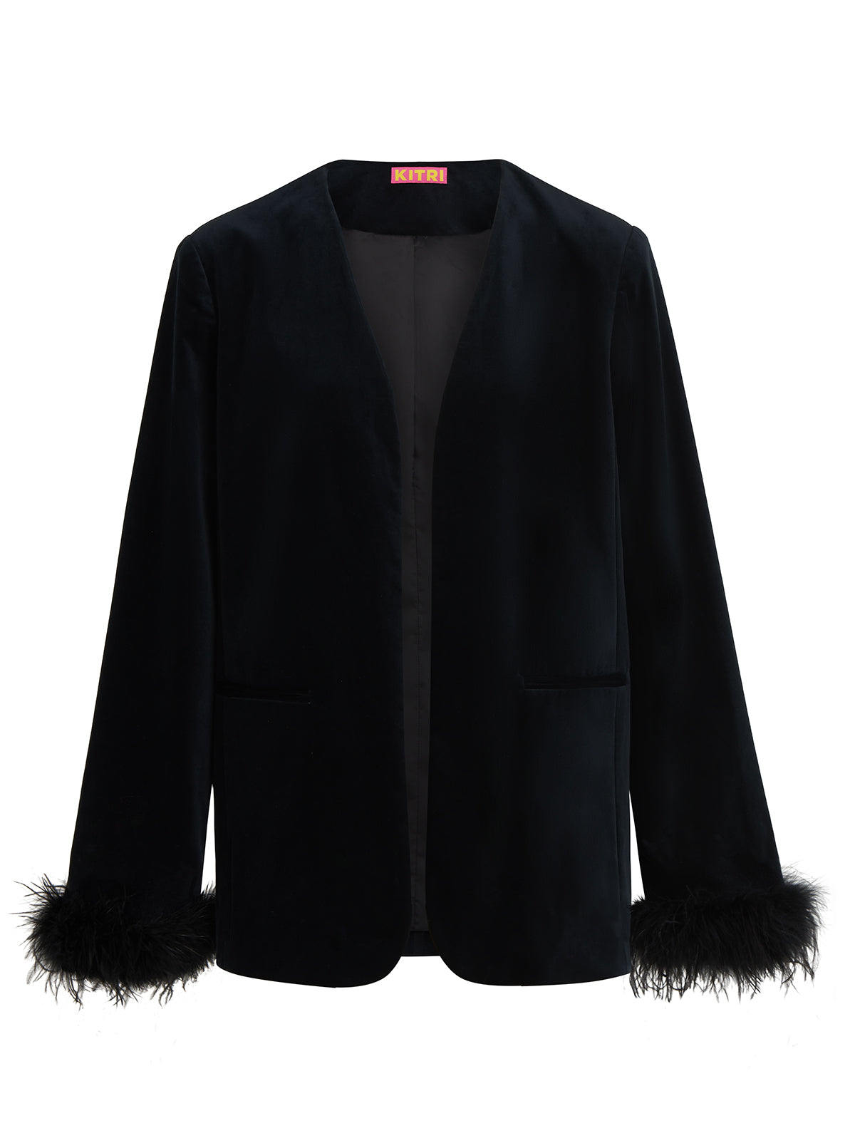 She’s a showstopper. Introducing Marlene, an elegant, boxy blazer featuring detachable feather cuffs for multiple ways to wear. Crafted from our new cotton-blend velvet, she is structured whilst still feeling soft to the touch. For the ultimate centre-stage moment, pair with co-ordinating Rosamund Black Velvet Trousers and Lou Lou Black Velvet Feather Top.