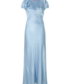 Introducing the Minka dress – a new romantic silhouette in a dreamy powder blue hue. Crafted from fluid viscose satin and bias-cut for an elegant drape, it features a flattering empire line, deep V-neckline with soft frill detail, and short puff sleeves. Perfect for summer soirées or special moments, it’s a fresh take on occasion dressing with vintage charm.