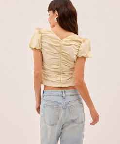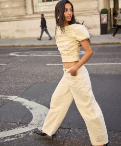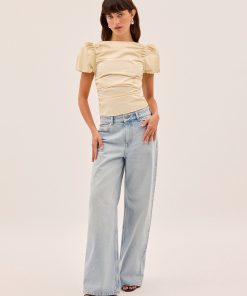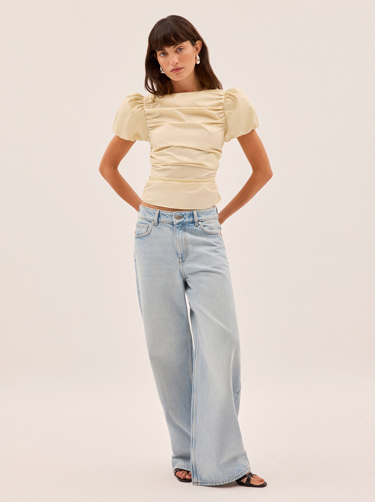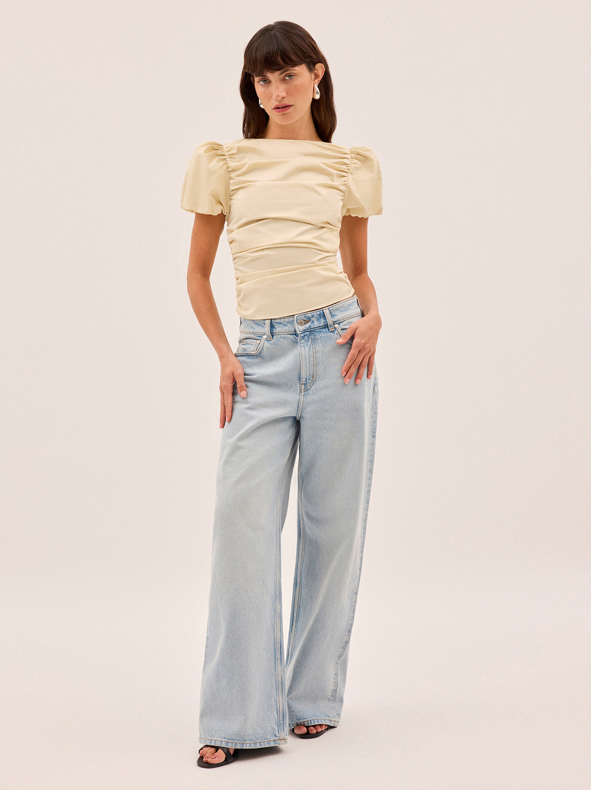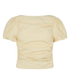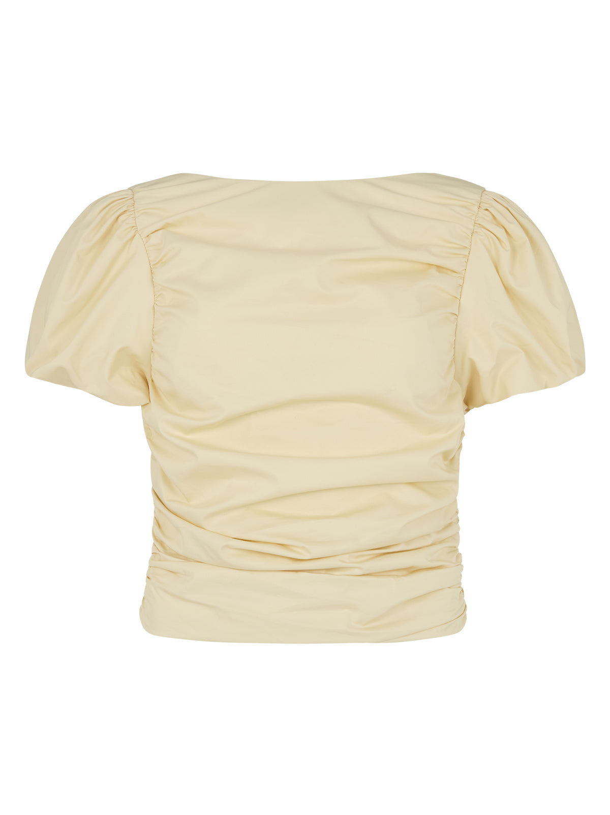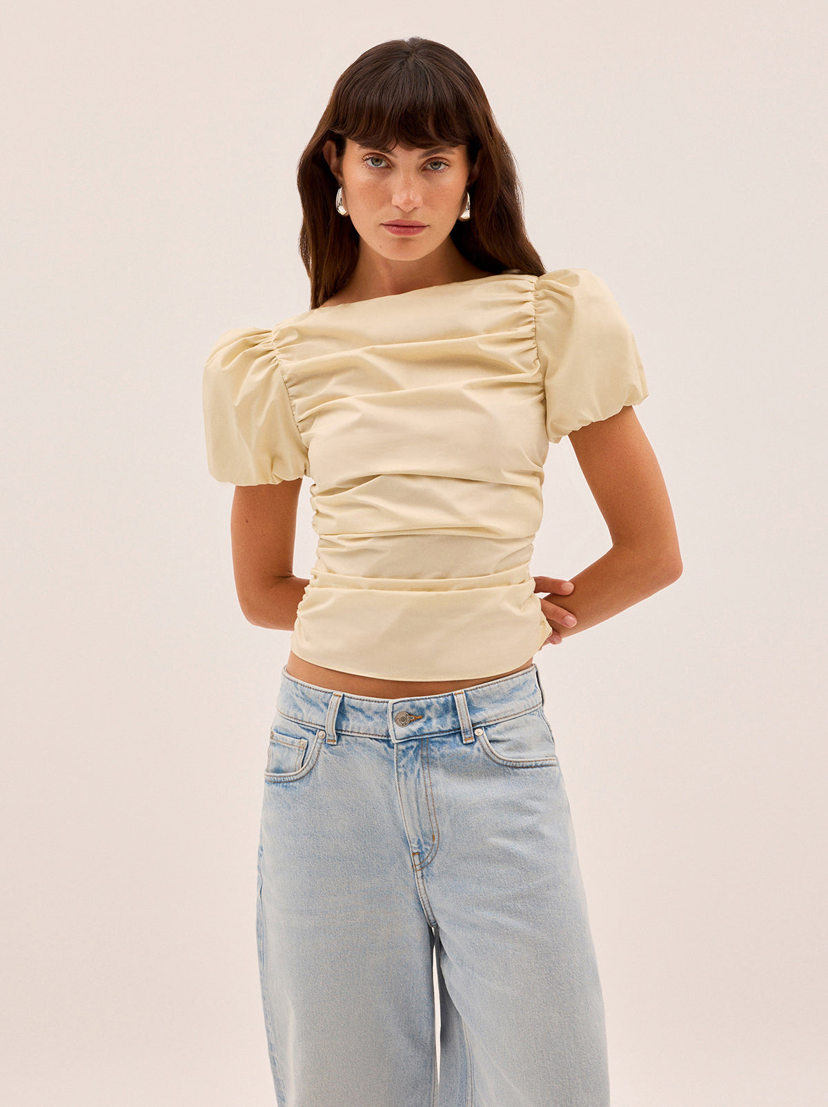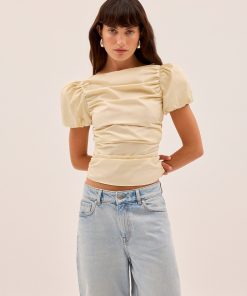 The Nyla top is an elevated essential crafted from mid-weight cotton in a rich vanilla shade. Designed with a wide boat neckline and voluminous puffed short sleeves, it features flattering ruching through the body and a slim, sculpted fit. A versatile day-to-night piece that pairs effortlessly with denim or tailoring.