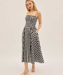 An update on our bestselling Alberta dress, Sabrina is made from a lightweight linen blend in timeless black gingham. Featuring delicate spaghetti straps, a black ribbon bow at the neckline and a full, panelled skirt designed for movement. A sweet nod to vintage silhouettes with a modern, wearable feel.