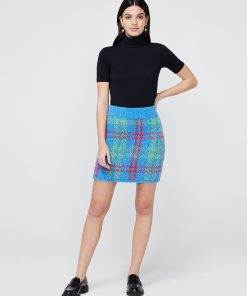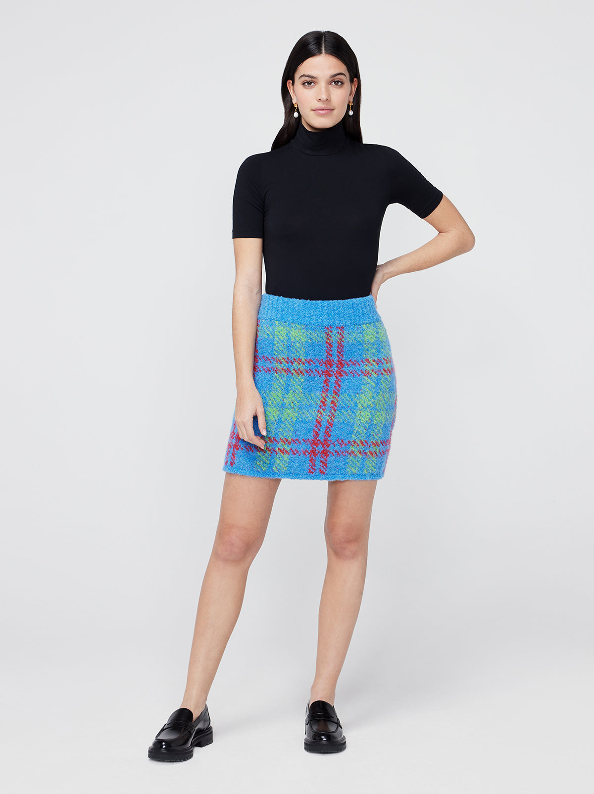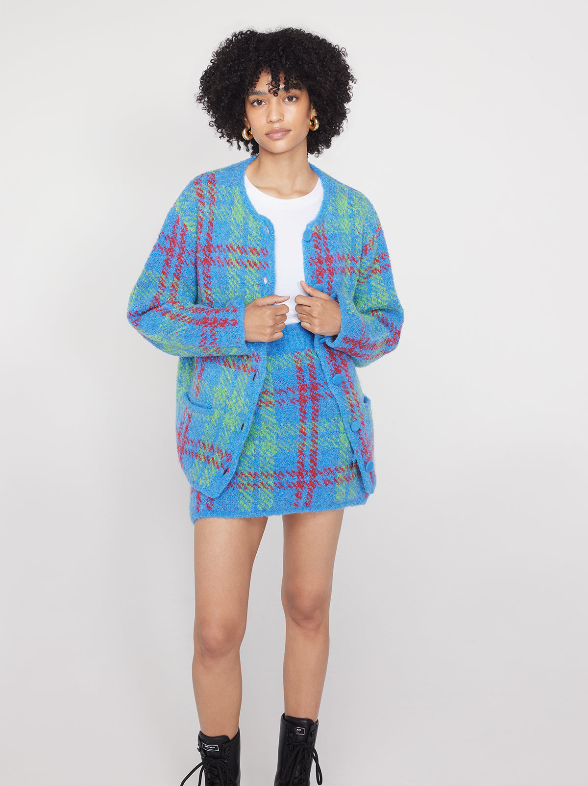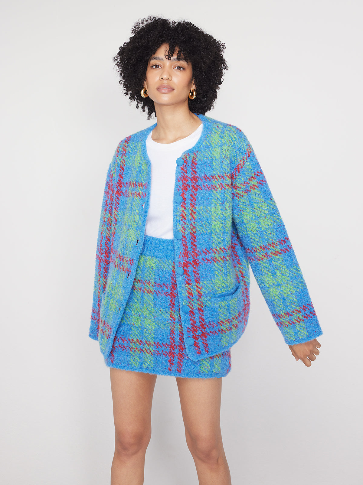 Pairs well with pearl earrings FYI. Susan is a cosy bouclé skirt featuring a bold check print inspired by the punk-chic runways of the early ’90s. Live out your co-ord dreams with our matching Pandora Blue Check Boucle Knit Cardigan.