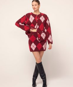 Just tell them it’s vintage. Susan is a cosy mini skirt that combines retro charm with modern-day wearability. Her bold burgundy argyle print is eye-catching yet refined, and the textured bouclé fabric provides warmth and comfort as the cooler months roll in. Susan’s flattering fit ensures she’ll quickly become a favourite in your wardrobe, whether you style her with tights and boots or opt for a bare-legged look when the weather allows. For the ultimate throwback vibe, pair Susan with the matching Pandora Burgundy Argyle Knit Cardigan for a co-ordinated set that’s both nostalgic and contemporary.